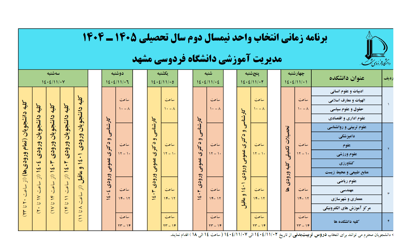 به آگاهی دانشجویان عزیز میرساند، برنامه زمانی انتخاب واحد نیمسال دوم تحصیلی 1405-1404 به بازه زمانی 1 تا 7 بهمنماه تغییر یافته است. جزئیات مربوط به انتخاب واحد در جدول زیر قابل مشاهده است. ضمنا امتحانات حضوری پایان ترم از 7 تا 21 بهمنماه بدون هیچگونه تغییری در برنامه مقرر برگزار خواهد شد.